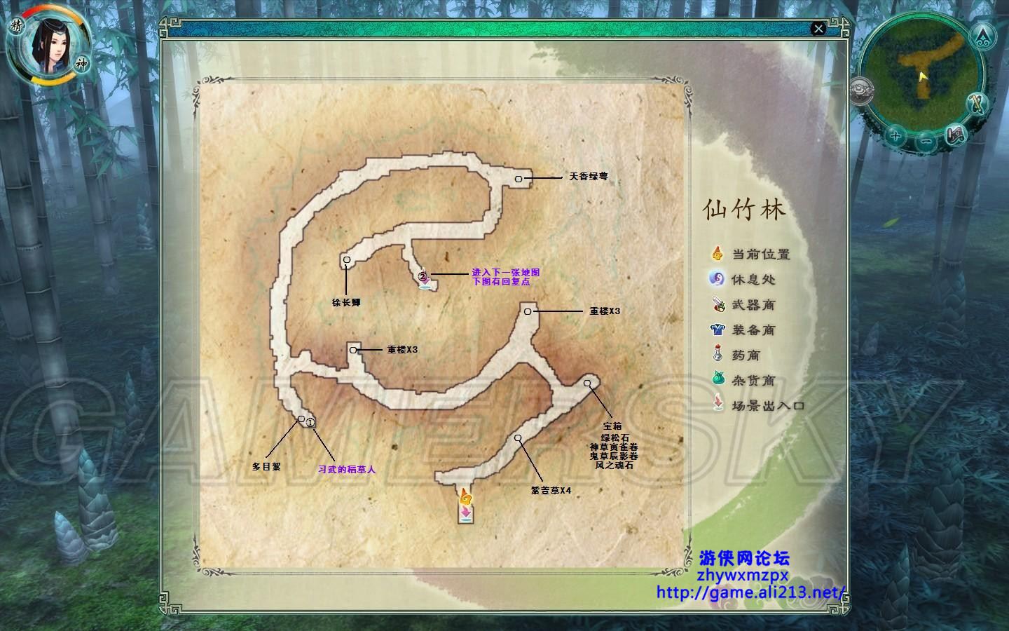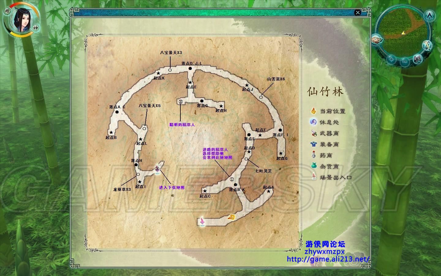 这个地方呢我又把瑕妹纸给下放了。此地图有很多传送阵可以快速到达某处,地图上★为法阵起点●为法阵落点,字母为对应法阵编号请自己看好, 先去①处和稻草人对话选择帮忙可以得到地图,在②处可以找到聪明的稻草人,和他对话可以得到称号助人为乐。,得到助人为乐称号后可以出仙竹林找个有小孩的城买称号装备,鸠翼披风入手4件属性十分不错,然后去折剑山庄道具店买上4个强雷 。通过起点d-e-f-g-h即可到达③处进入下一张仙竹林地图。