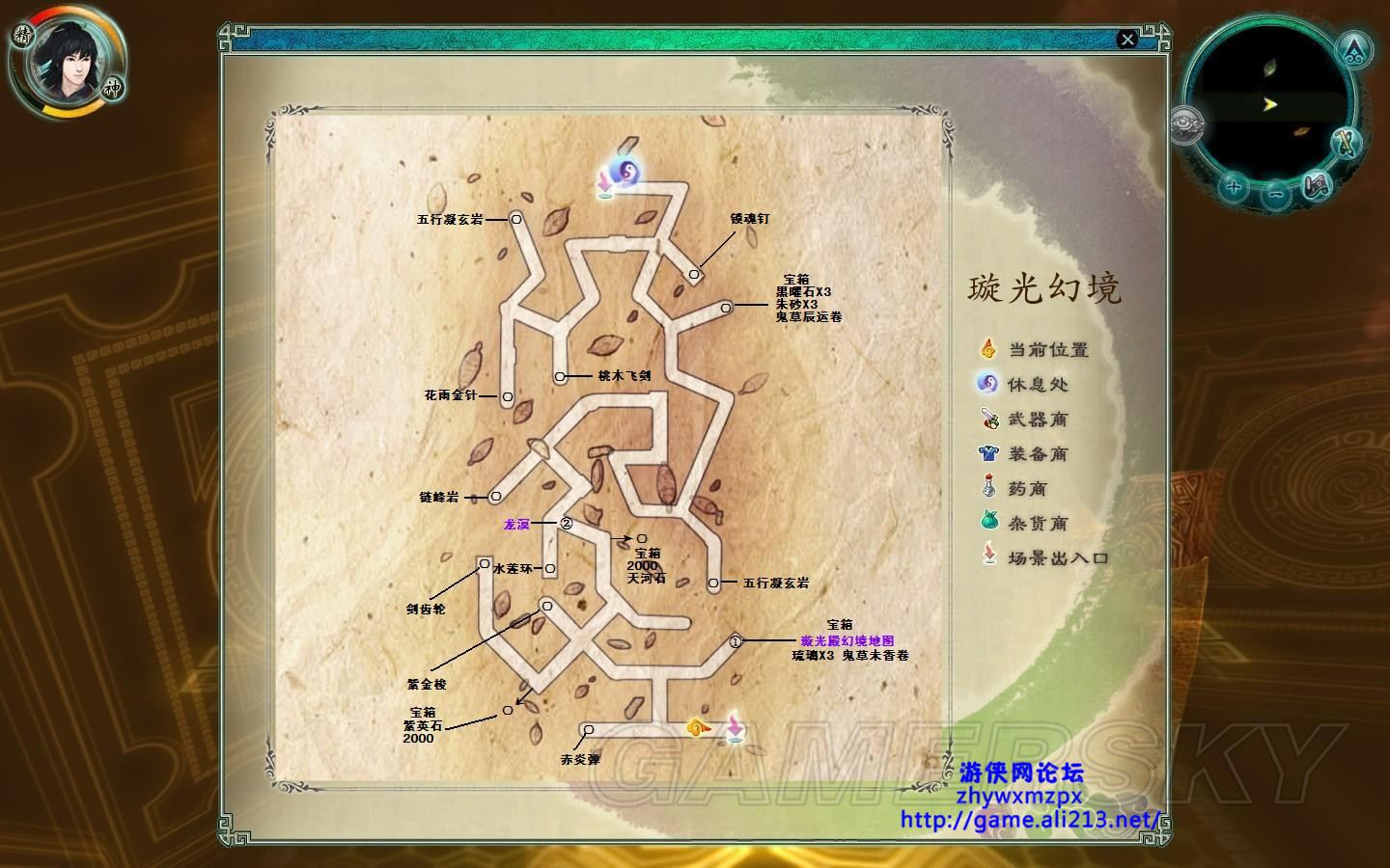 首先去①处开宝箱拿到璇光殿幻境地图 ,本地图有些影藏道路,靠近就会看见宝箱,注意一下。②处可以看到龙溟,剧情后龙溟入队,给他换上好装备,把暮菖兰下放吧。走到休息点不要急着进去,可以先练练级,这的怪经验还不错,特别是纸怪很好欺负。练得差不多了就进去触发剧情吧。