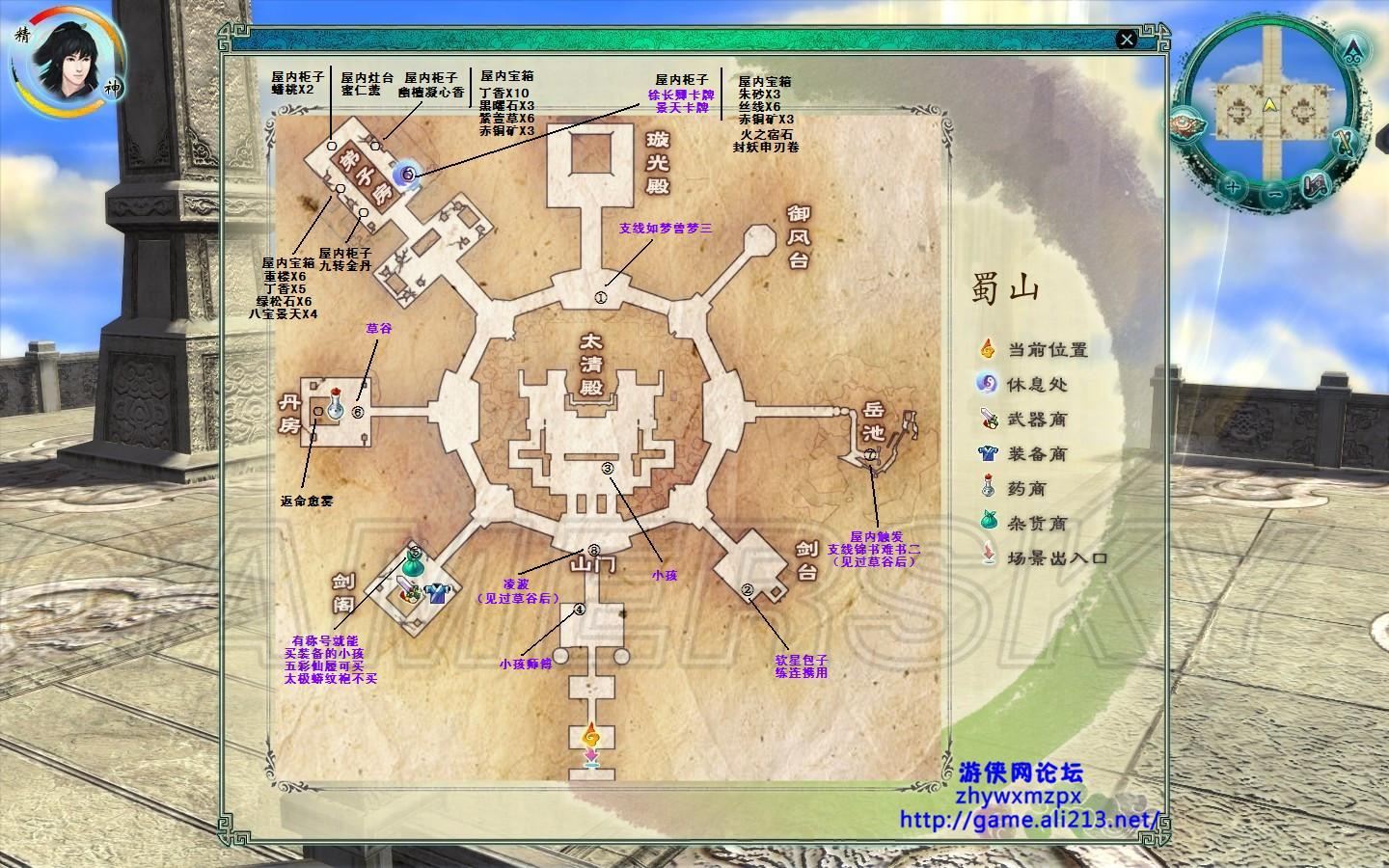⑤处的孩子那可以给凌波买双五彩仙履,之后先不要去⑥处找草谷,先飞去楼兰。