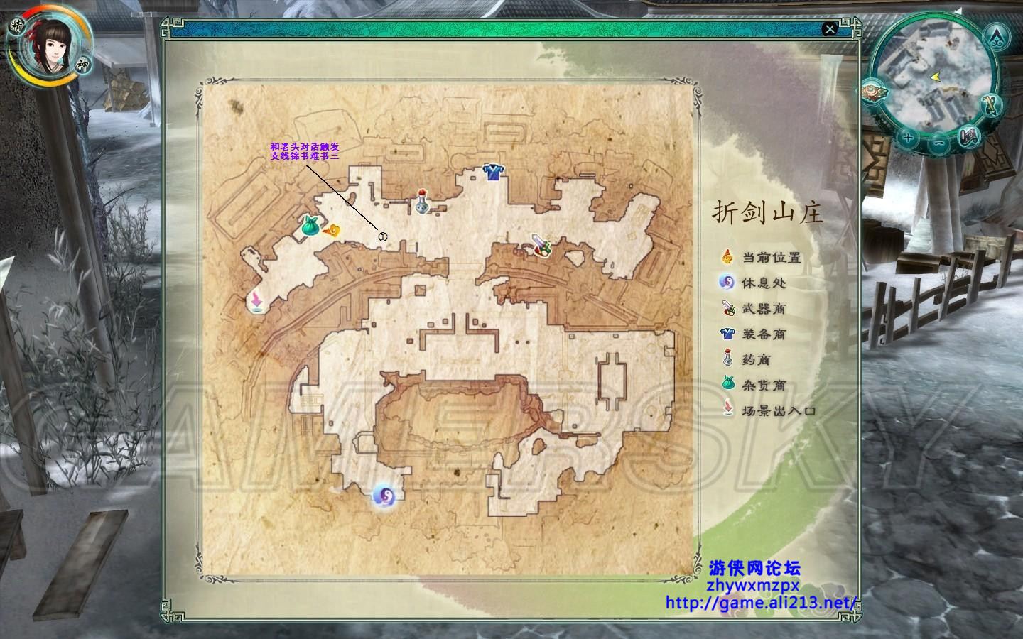 去⑦处经书房触发该支线,接着飞去折剑山庄,和①处的老头对话,然后此线暂时告一段落。