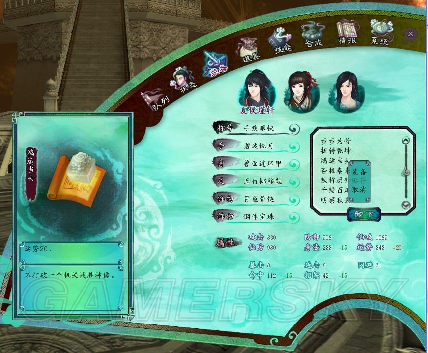关闭3个灵台后会进入战斗,三皇有3个称号,我这里还是建议拆开来做(想一起都做也要看脸,因为转到神农,招一堆小怪很麻烦,会浪费我方输出)。首先第一场做鸿运当头,不打破一个机关战胜神像。意思是不要用群攻技能打到下面的2张脸,加好3级水,然后用每个人擅长的4级仙术轰即可[龙溟4雷,凌波4风,另外负责群补,夏侯4火,瑕妹纸负责加3水,没神了用之前偷的天仙玉露,辅助凌波群补](龙溟和凌波的合击可以用,连携技禁止,当然你有的话),十分容易就过了。(特别补充,上手可以用夏侯加潜龙打全力输出一波)