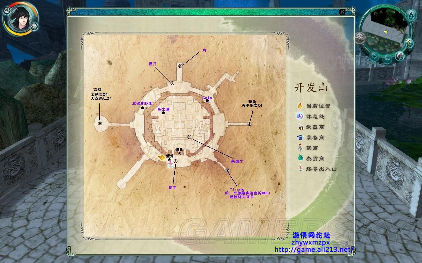 ③处的yliong会给一个加跑步速度的buff,应当优先去拿到。④处的乌龟可以拿4个甲盾砺岩,⑥处的惑幻和他对话也能拿到些东西。⑦处有个叫魔月的包子说收集完卡牌再去找他,由于现在卡牌不全只有先放着,待以后齐全了再来找他。