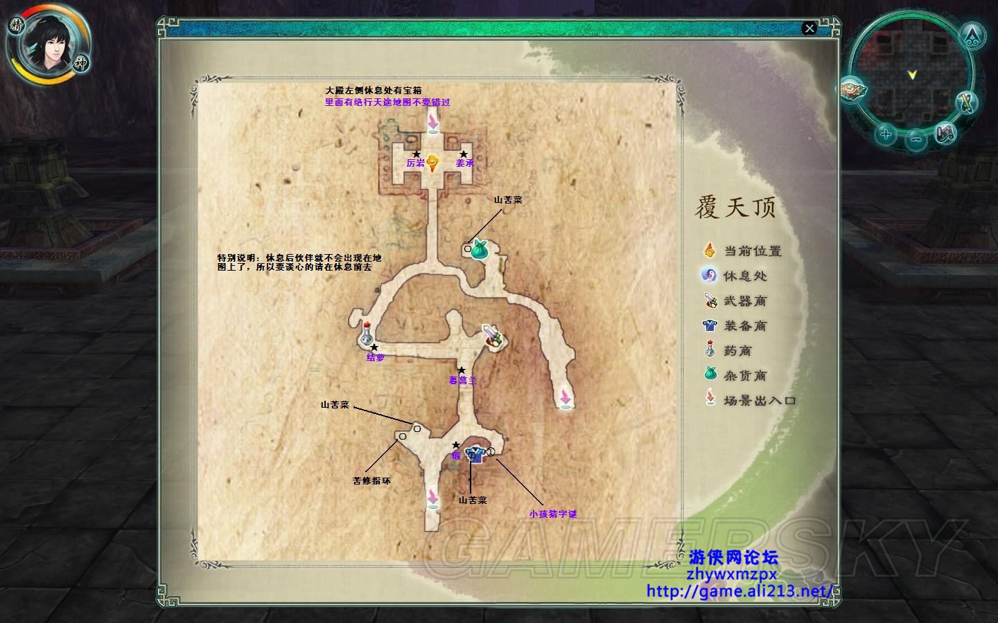 有新的武器防具可以买了,都整理好了就回大殿左侧的休息处休息( 休息处有宝箱绝行天途地图,风神靴 )