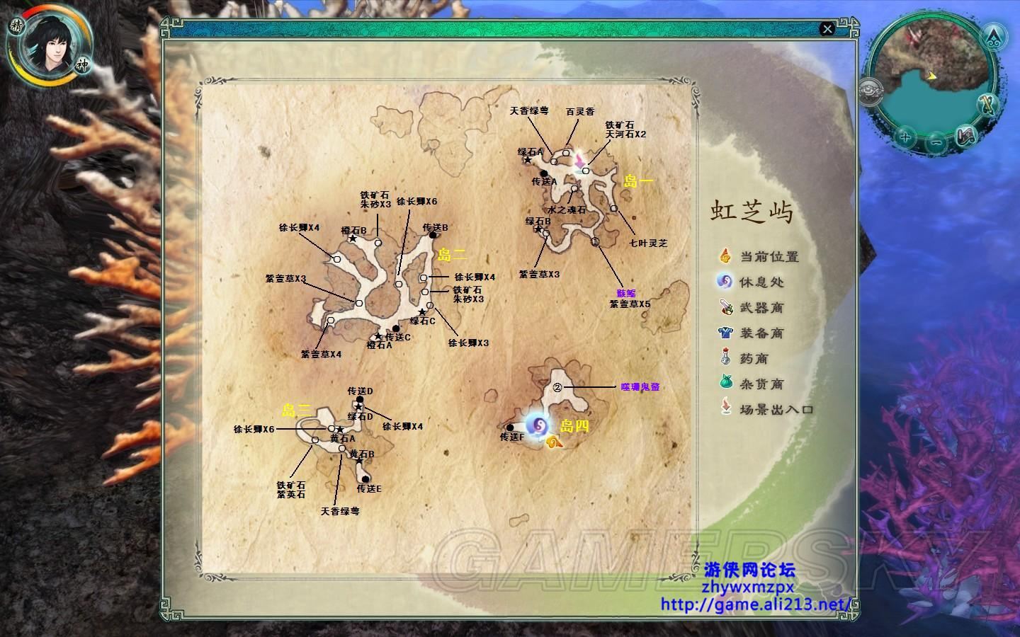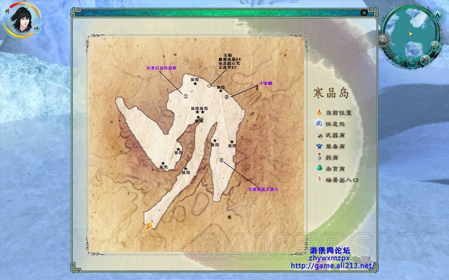 去②处可以触发支线侠道人道九,③处的小冰麟会要你找岛上的贝壳,一共10个,找到后换天罡斗衣。然后再进传送阵,去到虹芝屿。